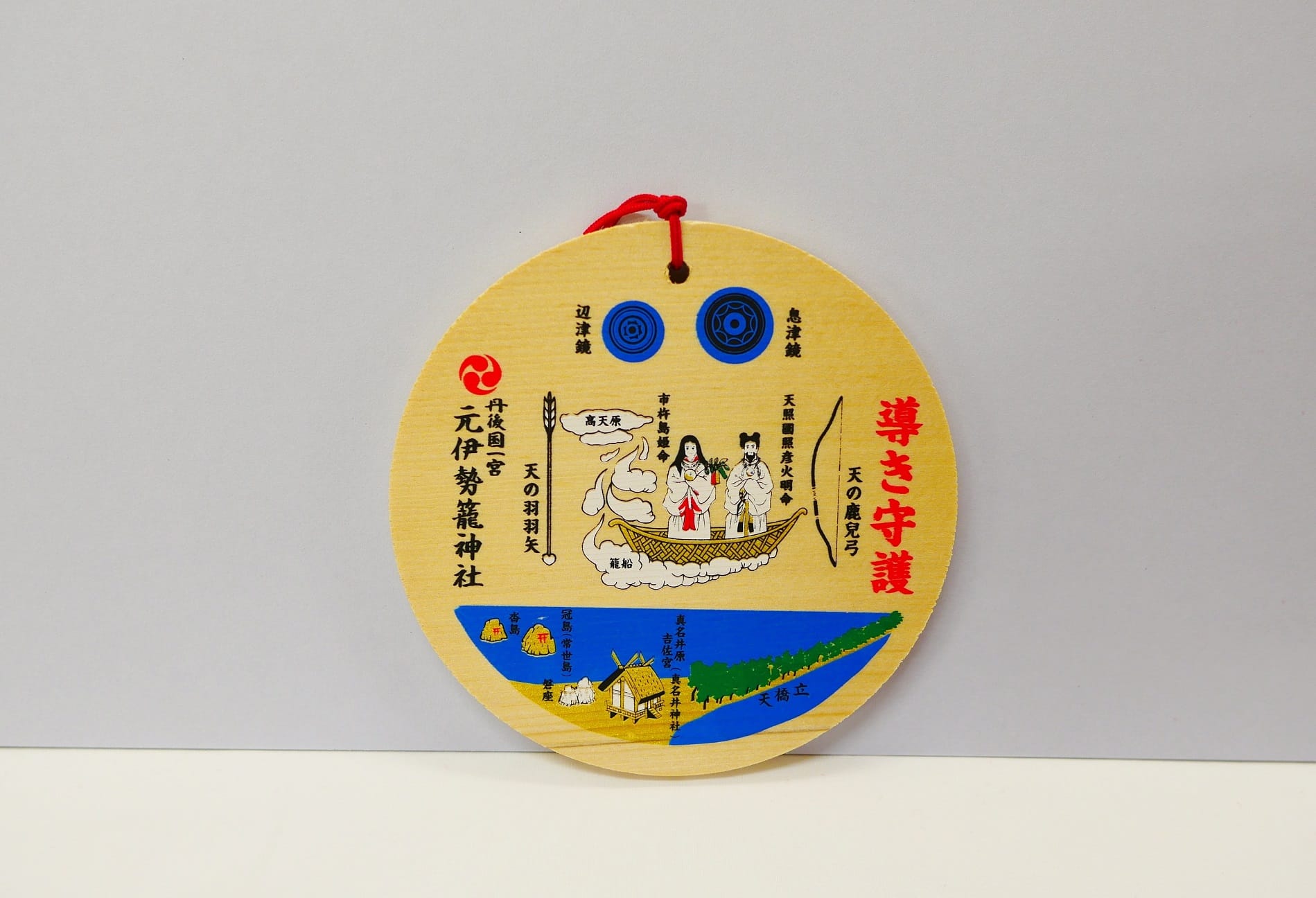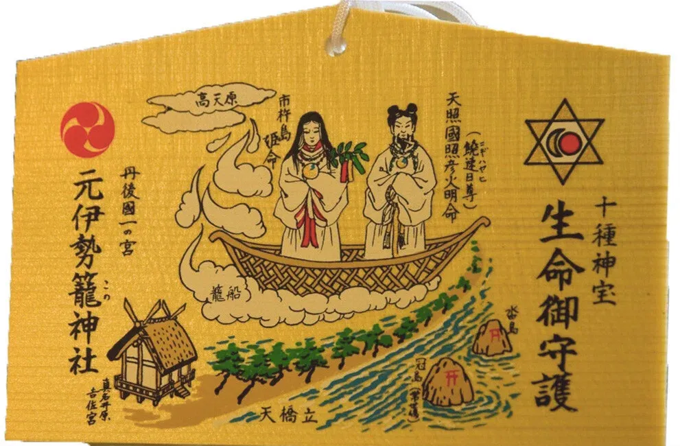 Till very recently, the main amulet sold at Kono Shrine featured a hexagram with sun and moon as the Shrine's crest. The amulet featured the pair of male Kami, Amateru-kuniteru-hiko-hoakari-no-mikoto (天照国照彦火明命), also marked in parenthesis to be Nigihayahi-no-mikoto (饒速日命), and female Kami, Ichikishima-hime-no-mikoto (市杵嶋姫命), riding on a Heavenly Dragon Ship (天之龍船・Ama-no-ryu-fune).