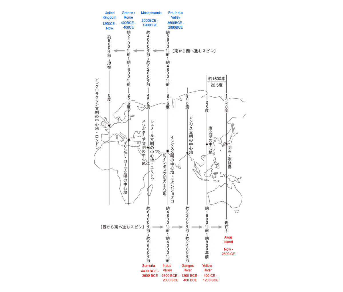 They made this move because they understood, from a study of astronomy and human culture, Earth and humanity have a synchronized rhythm. If you take a close look at human history you see that the spiritual-cultural capital of the globe switches back and forth from East to West at a rate of exactly 22.5 degrees longitude, or 1/16th of the Earth's circumference, per every 1600 years. When you map out the locations of major cosmopolitan civilizations in world history, including the regions of Mesopotamia, Indus Valley, Ganges River, Yellow River, Mediterranean, and British Isles, you see that they are 22.5 degrees from each other.