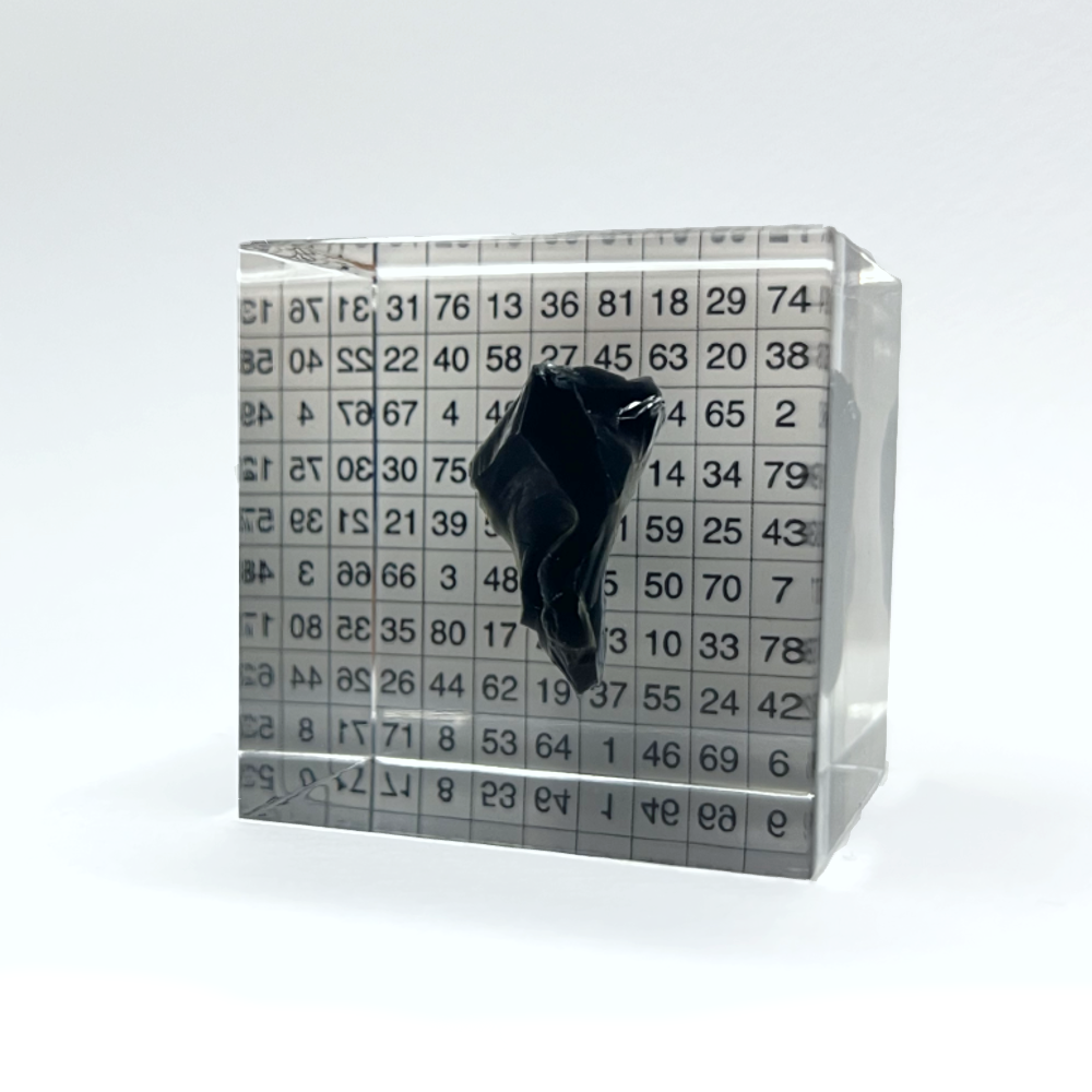 The clear resin cube, which houses a piece of obsidian, represents the connection between the Light-Pixel energy generated by your online activity and the Dark-Particle energy generated by your onland activity.
